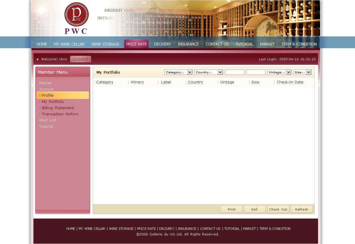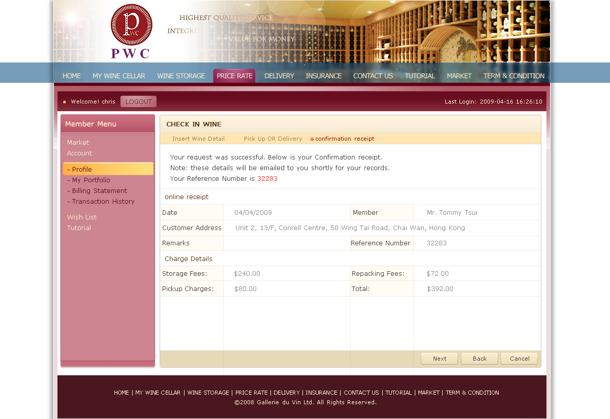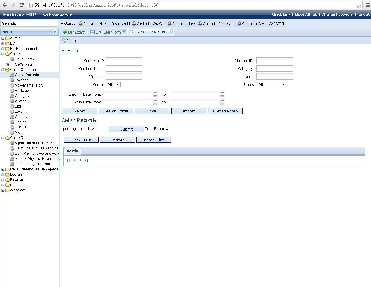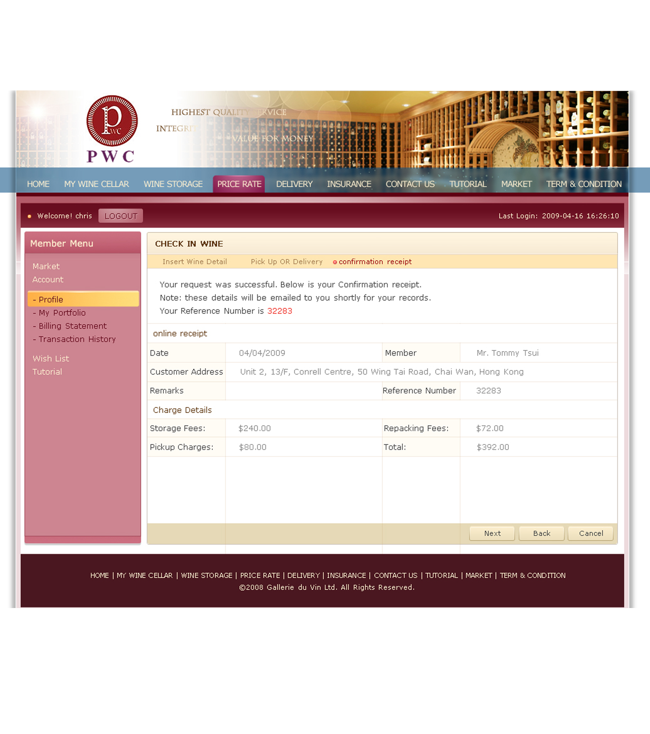 Wine storage 公司存貨操作系統,客戶可通過網頁登陸辦理對酒的檢入和檢出工作,此系統是由我們第一代CRM DoDo框架構建。